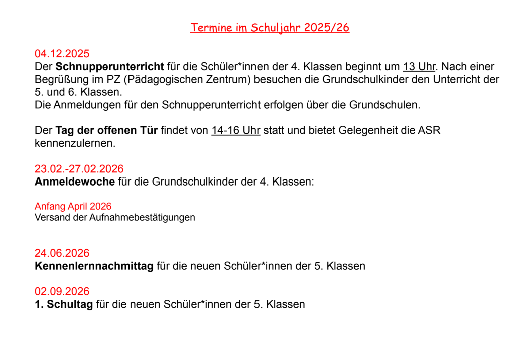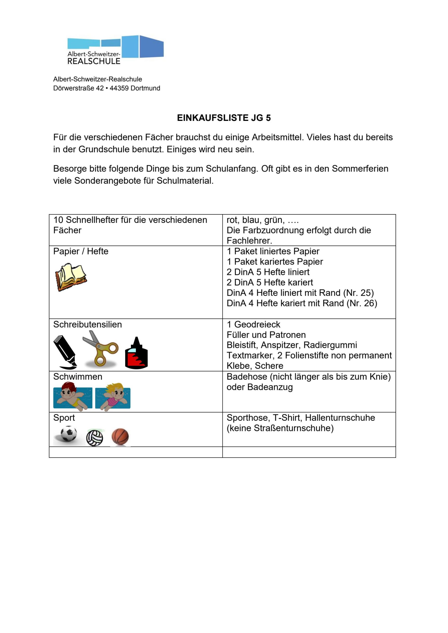 Einkaufsliste für die Schulanfänger im Jahrgang 5